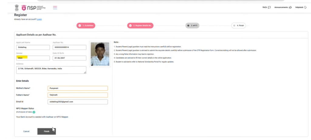 E-KYC is compulsory for all SC students. If a student does not complete E-KYC, their application will be rejected.