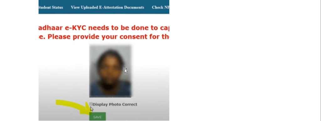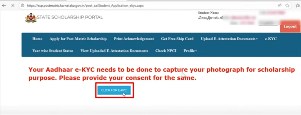 Click on the eKYC button, and it will prompt you to CLICK FOR E-KYC. It will inform you that your Aadhaar e-KYC needs to be completed to capture your photograph for scholarship purposes.